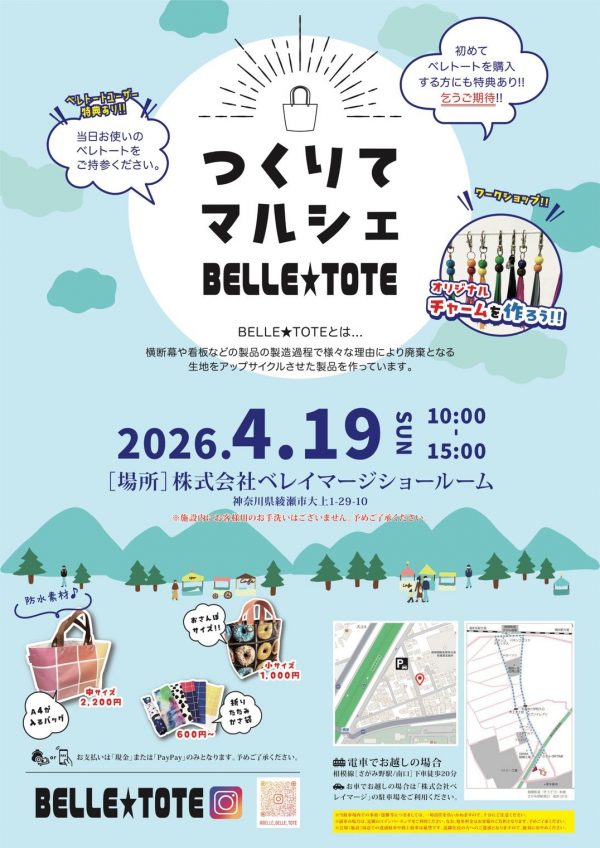 4月19日(日)に弊社ショールームにて、「つくりてマルシェ」を開催します。 BELLE★TOTEの販売会です。 5月のマルシェより、バッグの柄を一新するため現在のデザインの一部商品を特別価格でご用意いたします。 ご家族やご友人へのプレゼントにもおすすめです!! ご来場をお待ちしております(^^)/